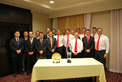 The celebration included an exchange of commemorative gifts from representatives of both companies. Representing Manitowoc Cranes was Eric Etchart, president of the company, and representing Kobelco Cranes was Akihiko Tsukamoto, also president.