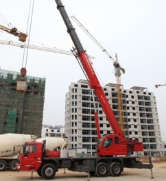 The GT25-5A is a 25 t capacity crane mounted on a three-axle carrier. It has a five-section 40.2 m telescopic boom that offers a 49 m maximum lifting height when working with the jib. Power for the crane comes from a Sinotruck WD615.92 engine, compliant to Euro III standards, offering a power output of 196 kW at 2,200 rpm.