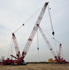 The 400 t capacity Model 16000 cranes are working at the MMHE fabrication yard in Pasir Gudang in Johor state, Malaysia. They are lifting loads of 50 t to 200 t including pre-assembled structural elements that weigh up to 200 t. Some of the lifts are carried out in tandem.