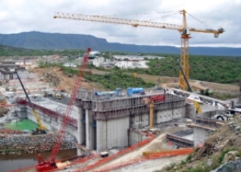The cranes are working as a team to build the outlet works of the dam, which will require 930,000 m3 of concrete to complete.
